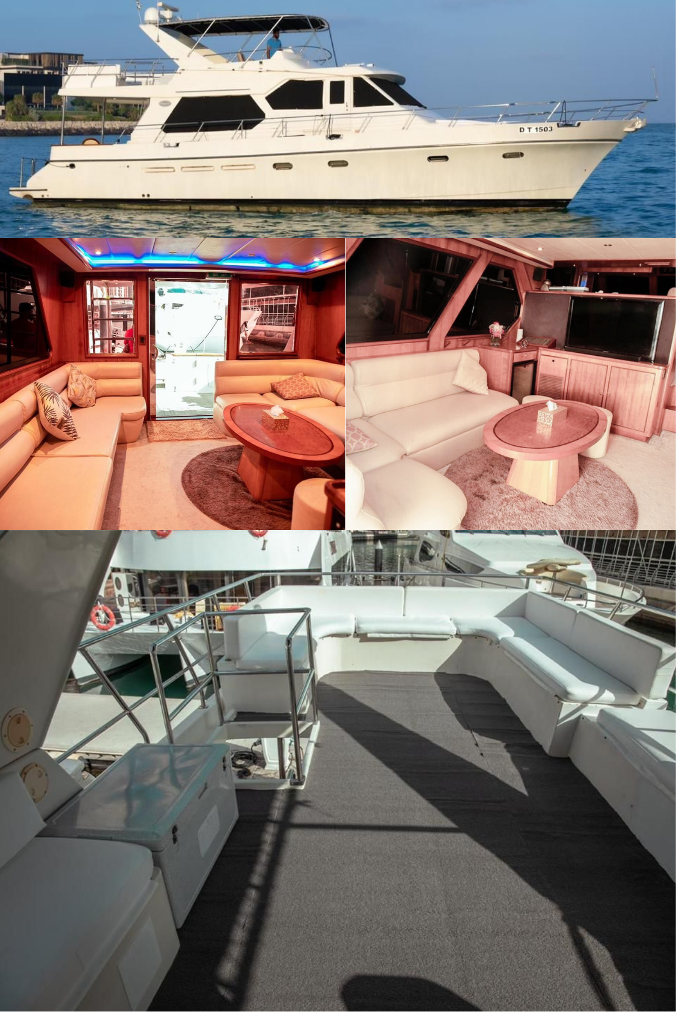 You can also make the private yacht booking of This Super Luxury 135 feet Yacht which is having 4-bed room with 2 very spacious Hall along with the washroom kitchen Satellite television, Music system and the very nice sitting place on the fly bride as well. Our price is Aed 3999 Each hour Only . Our offer include the water soft drinks and ice along with very good music system and fully Air conditioned yacht and you can also bring your own food and drinks in yacht.